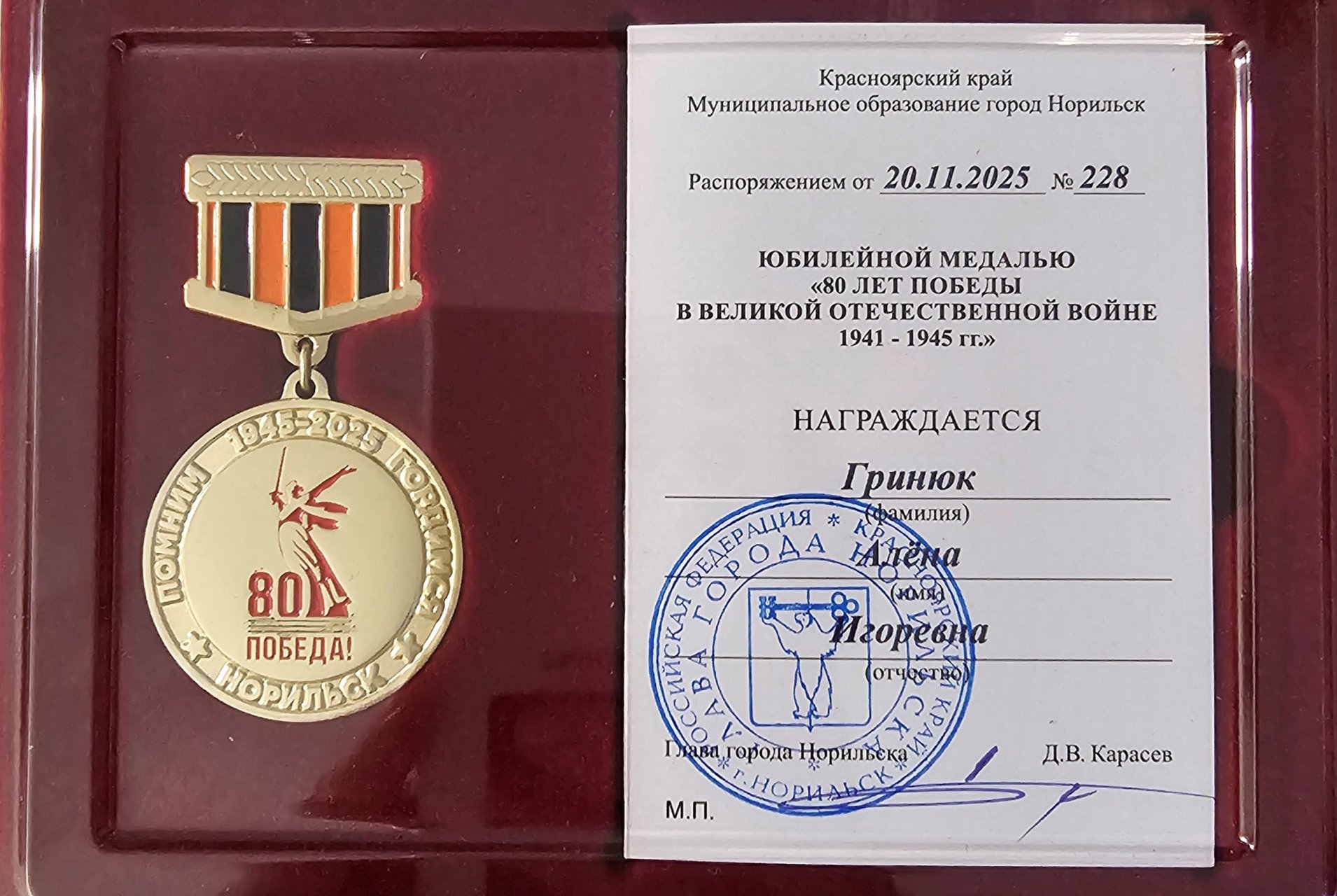Памятной награды была удостоена наша коллега — Гринюк Алёна Игоревна, заведующая отделом детских объединений и инициатив Дворца творчества детей и молодежи за свою неоценимую деятельность, направленную на гражданско-патриотическое воспитание юных норильчан. Её активное участие в праздновании 80-й годовщины Победы в Великой Отечественной войне стало ярким примером патриотизма и преданности своему делу. С 2011 года по сегодняшний день под ее руководством были разработаны, организованы и проведены следующие мероприятия, посвященные празднованию Дня Победы: фотовыставки и выставки рисунков, конкурсы плакатов, творческие мастерские, мастер-классы, концертные и познавательные программы, спортивные игры и флешмобы, социальные акции.