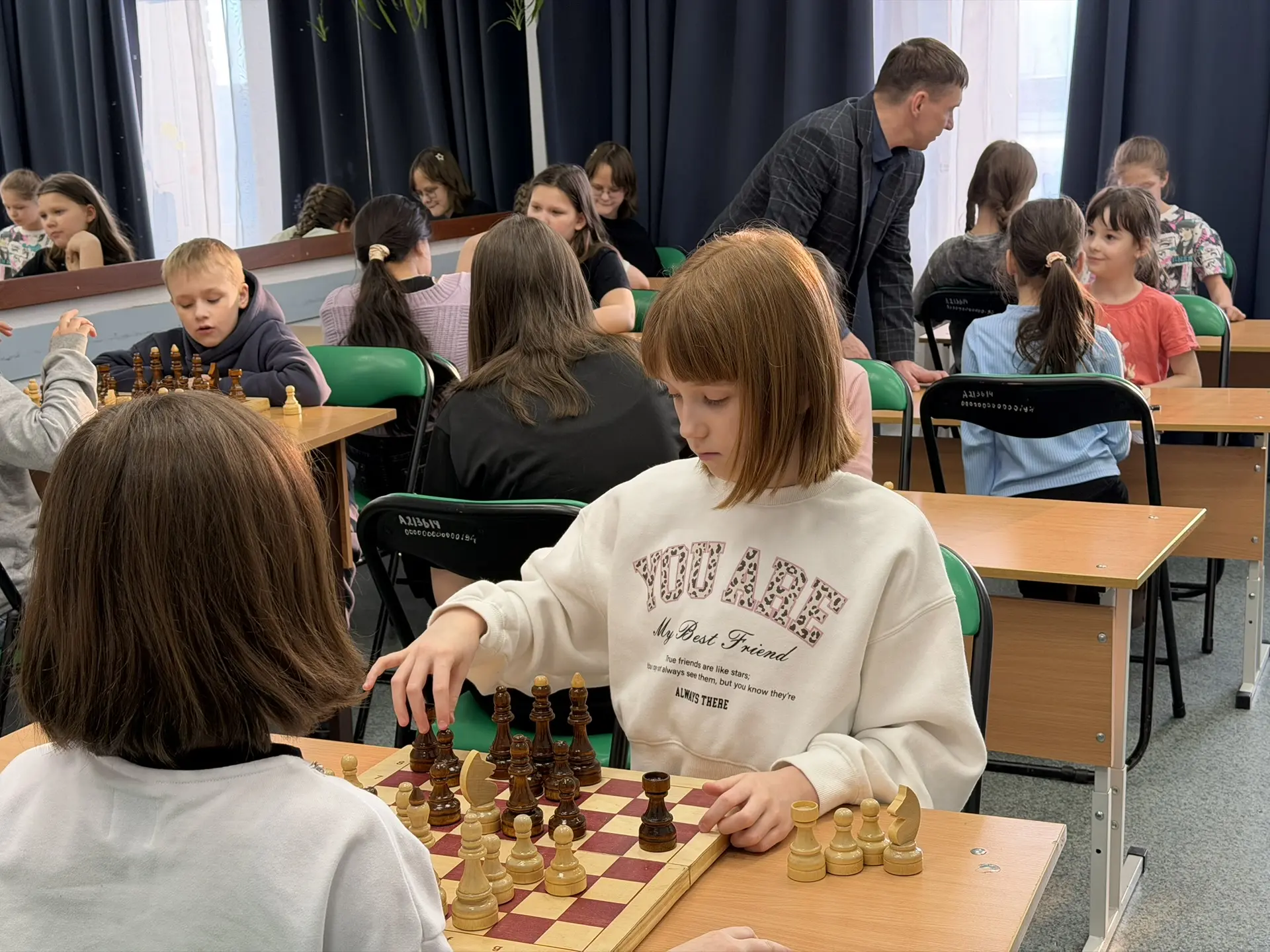 В минувшие выходные в нашем детско‑юношеском центре прошёл захватывающий шахматный турнир с интригующим названием «Ход королевы». Впервые за долгое время все творческие объединения «Горки» объединились не на сцене, а за шахматными досками и это было по‑настоящему вдохновляющее! Что было особенно трогательно: многие ребята впервые сели за шахматные доски. Но несмотря на отсутствие опыта, азарт, интерес и эмоции зашкаливали. Ребята сражались активно, продумывали стратегии, делалисмелые ходы и поддерживали друг друга. На лицах сосредоточенность, в глазах огонь соревнования, а в воздухе витала атмосфера настоящего интеллектуального праздника. Особая благодарность нашему педагогу Дмитрию Павловичу Роженцову — он не только провёл турнир, но и доступно рассказал ребятам о правилах игры в шахматы, а